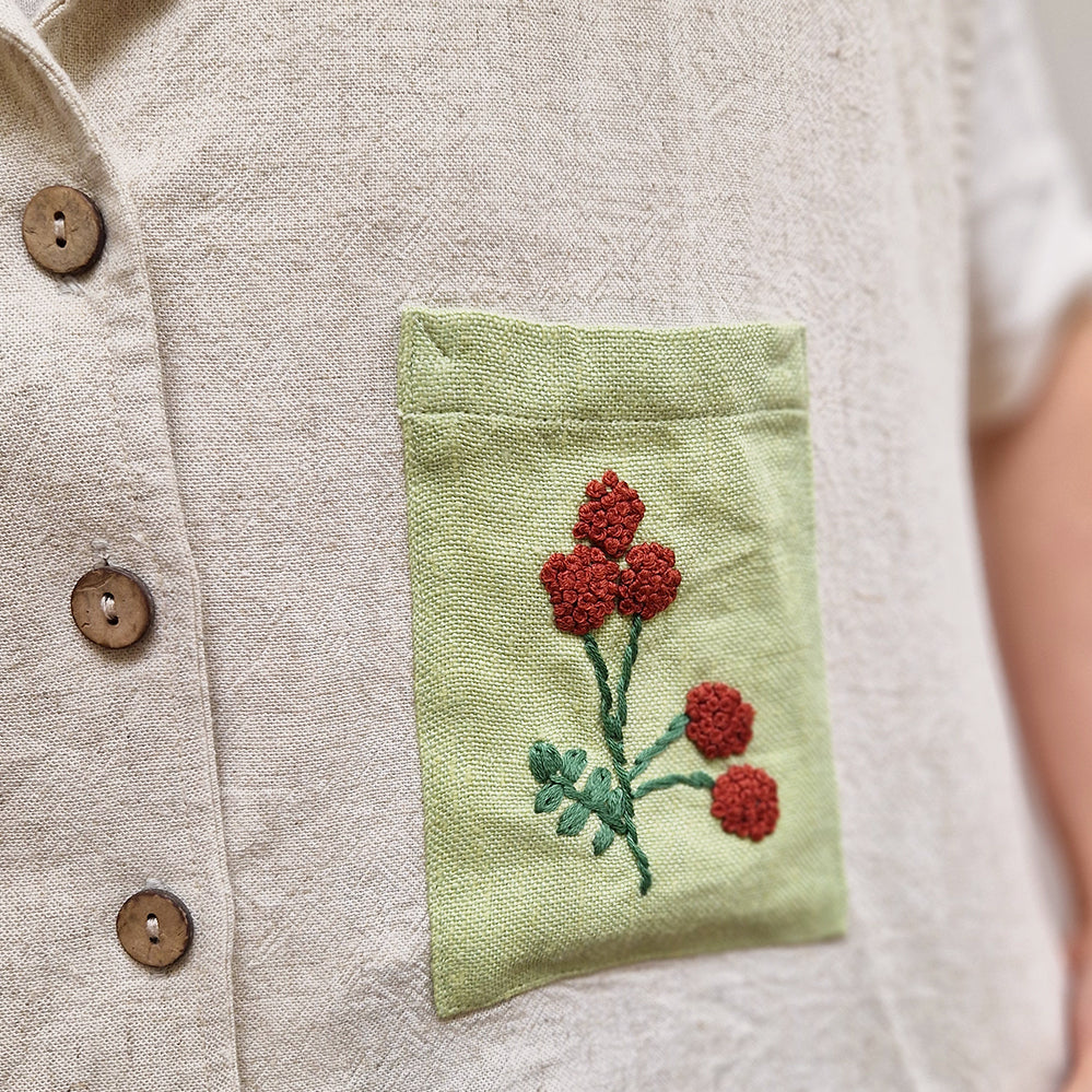 Two bumblebees drift toward a flower on the opposite side, a tiny, deliberate dance captured in thread. The collar is edged with a delicate, decorative border, an extra touch of care that frames the neckline with warmth and finesse.