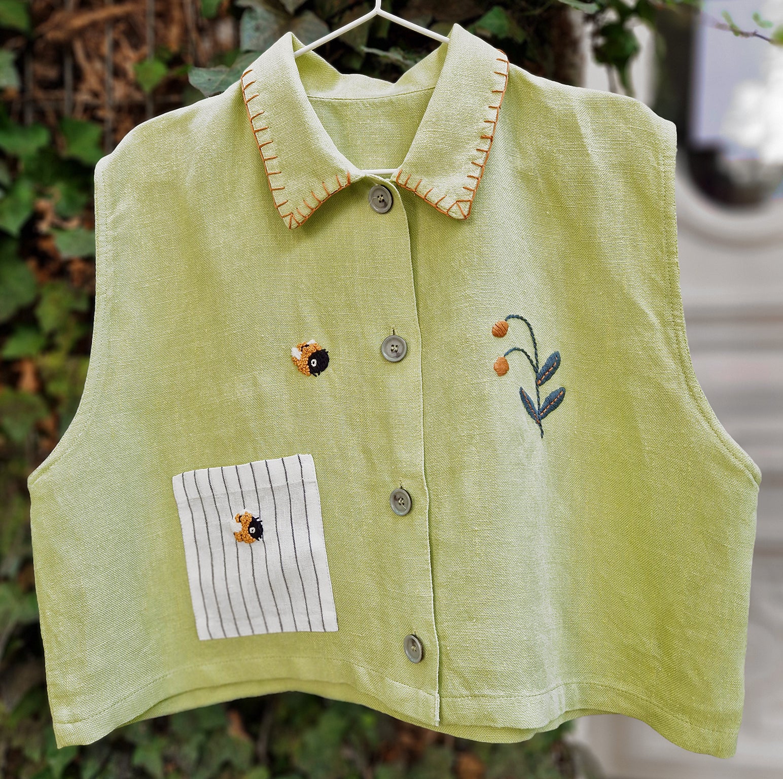 Two bumblebees drift toward a flower on the opposite side, a tiny, deliberate dance captured in thread. The collar is edged with a delicate, decorative border, an extra touch of care that frames the neckline with warmth and finesse.